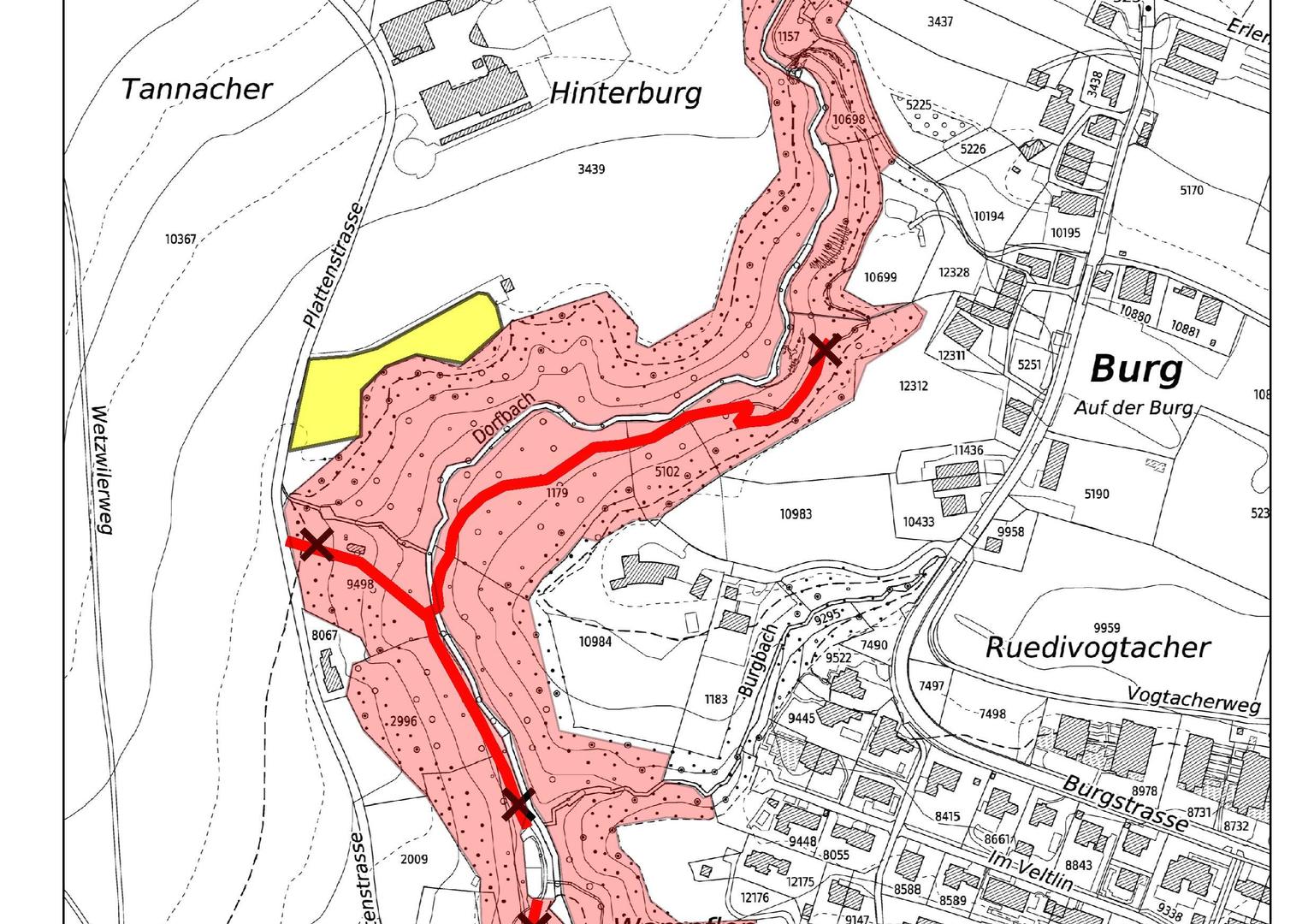 Im gesamten Dorfbachtobel, zwischen Wasserfells und Burgstrasse, werden zwischen dem 1. Dezember und dem 23. Dezember 2025 Bäume gefällt. Aktuell kennzeichnet der stellvertretende Revierförster zusammen mit Kreisforstmeister die betroffenen Bäume. Dabei handelt es sich um kranke oder bereits abgestorbene Eschen sowie stark einseitig gewachsene, umsturzgefährdete Bäume. In den letzten zwei bis drei Jahren ist es immer wieder vorgekommen, dass Bäume zusammen mit ihrem Wurzelstock umgefallen waren. Für die Verbesserung der wichtigen «Schutzwaldfunktion» beispielsweise bei Hochwasser oder Erdrutschgefahr sowie aus Sicherheitsgründen gegenüber Waldspaziergängerinnen und Waldspaziergängern müssen die markierten Bäume entfernt werden.
